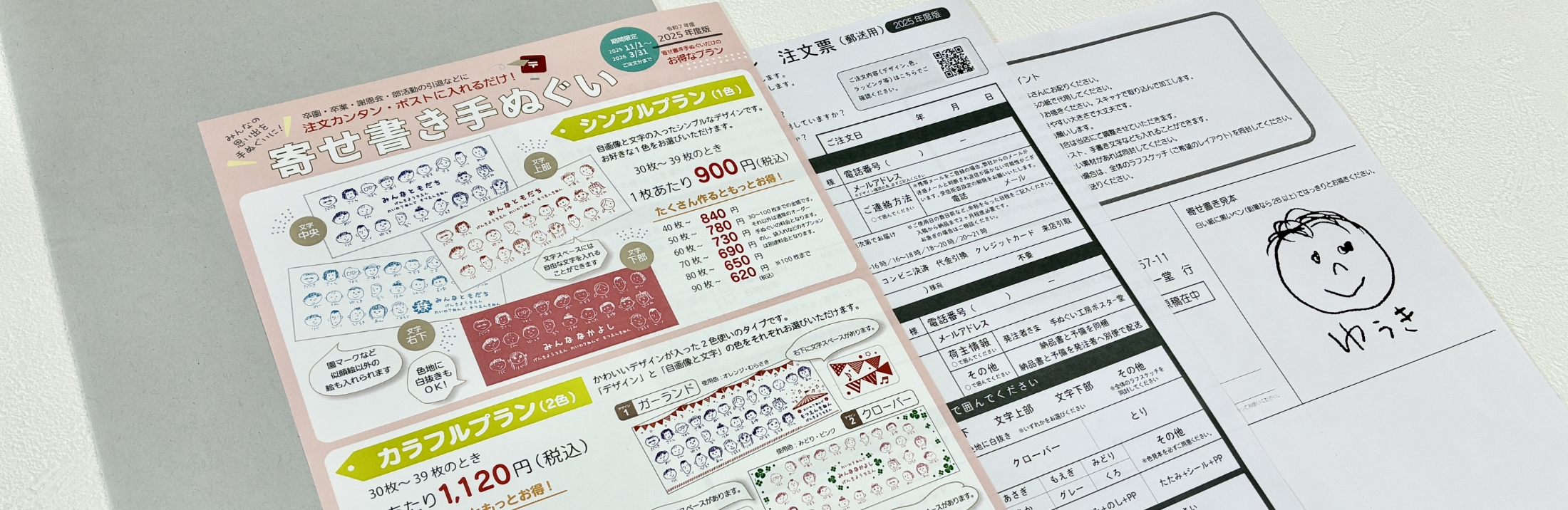 カタログ、注文票、寄せ書き用の用紙が入った「寄せ書きキット」を無料でお届けいたします。