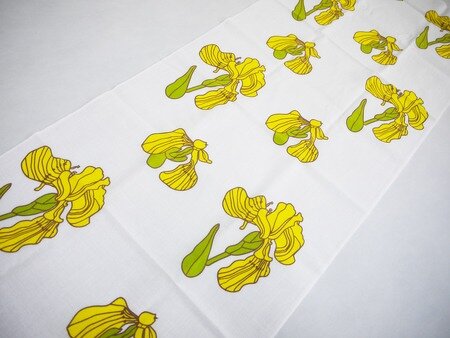 富山県の自閉症者支援施設「めひの野園」さんのオリジナル手ぬぐいです。 利用者さんが絵画教室で描いた絵を手ぬぐいにしました。 このお花は黄菖蒲でしょうか? 黄色、グリーン、薄茶の3色使いです。優しい色使いが素敵でしょ? キッチンや洗面所にかけておくと、パッと明るく華やかになりそうですね。