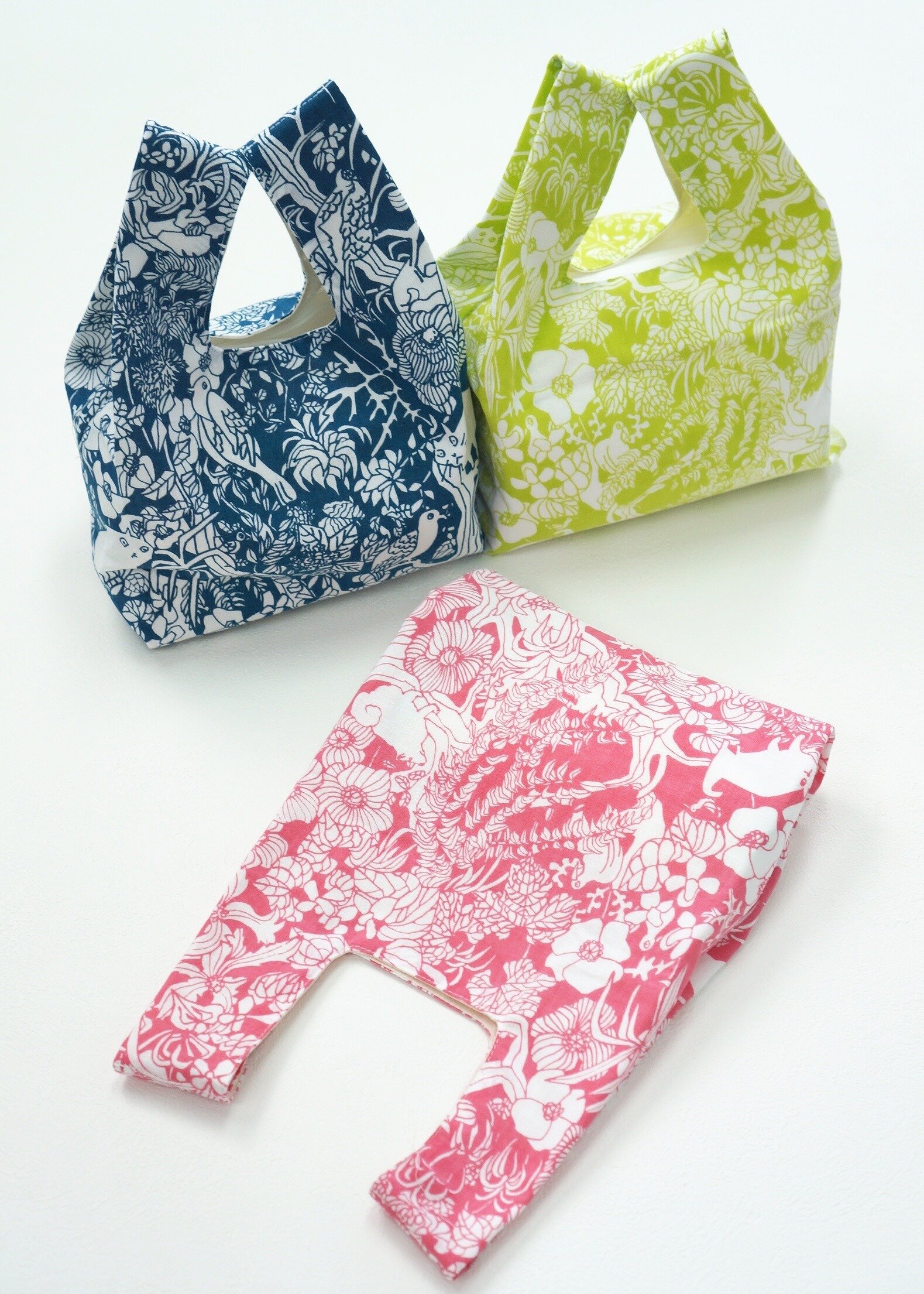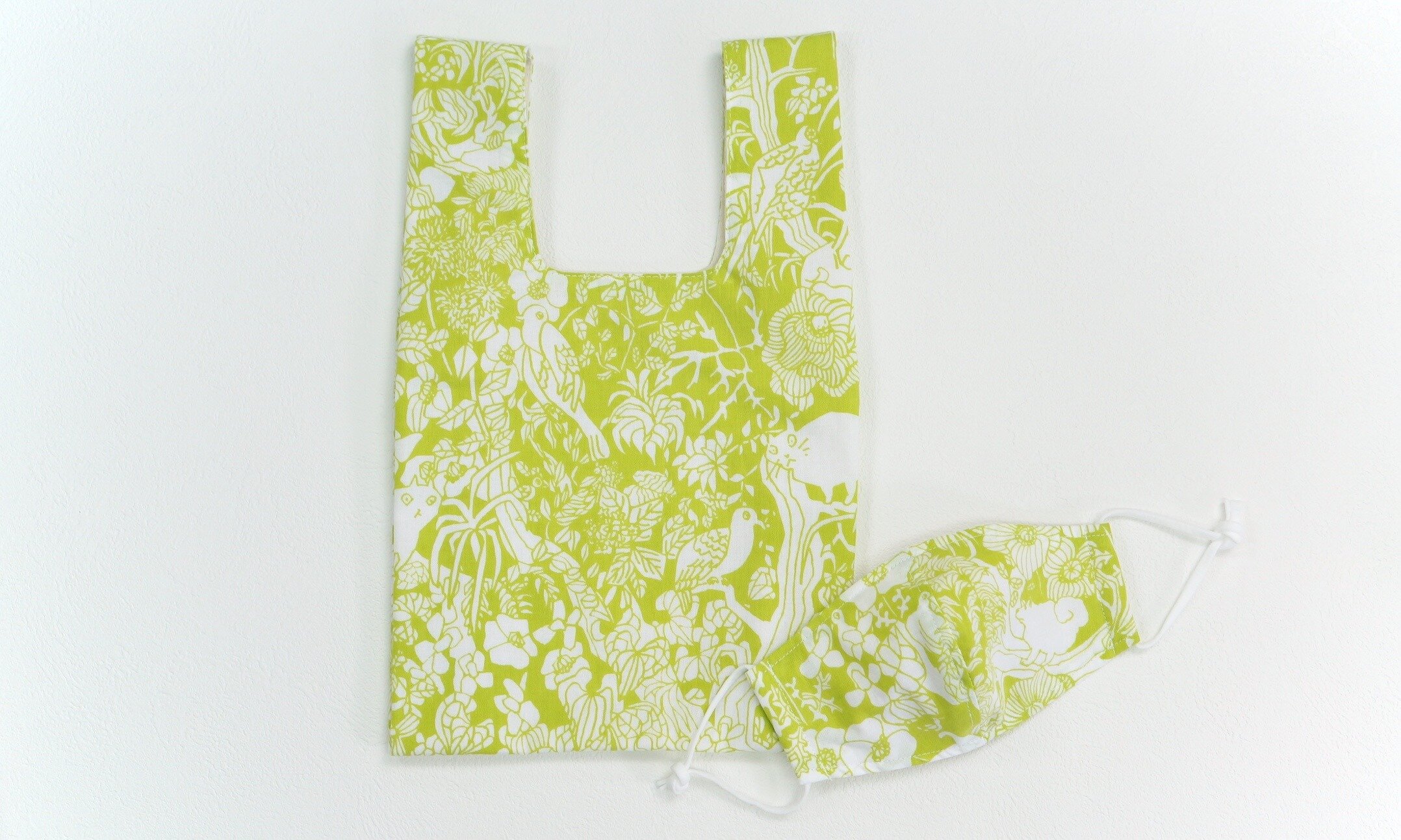 手ぬぐいバッグとコンビニバッグ1点は手ぬぐい1枚から、マスクは5点セットで手ぬぐい1枚からの加工になっております。