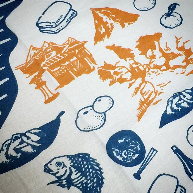 【 色数:2色 / 生地:岡 / ヨコ柄 】 四国ツアーの記念品として作成されました。 道後温泉、石鎚山、面河渓、瀬戸内の鯛、今治タオルなど、名所や名産が色々入った手ぬぐいです。