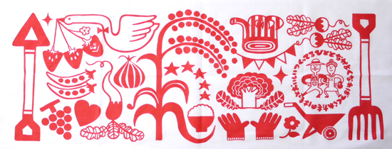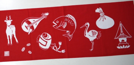 【 色数:1色 / 生地:岡 / ヨコ柄 / イラストレーター 】 イラストレーターまつむらさえさんの作品です。 鯛や鶴などおめでたい楽しい柄です。鮮やかな赤が綺麗です。 ご自身の個展での展示用に作成されました。